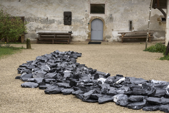 Im Schönthal zeigt sich diese Haltung exemplarisch in den drei gezeigten Arbeiten: Steinsetzungen strukturieren den Raum, während im Aussenraum Linien die Bewegung der Landschaft aufnehmen. Mit dem „Mud Work“ im Kirchenraum tritt zudem eine gestische Dimension hinzu: Spuren der Hand, Verdichtungen und Übergänge, die den Entstehungsprozess und die Bewegungen des Künstlers sichtbar machen.