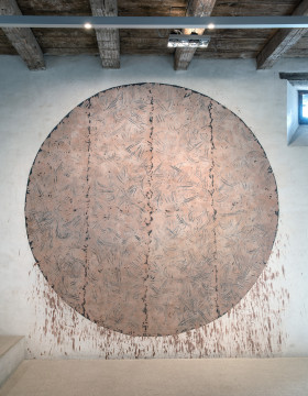 At Schönthal, this approach is exemplified in the three works on view: stone settings structure the interior space, while in the outdoor area, lines follow and articulate the movement of the landscape. With the Mud Work in the church, a gestural dimension is introduced: traces of the hand, accumulations, and transitions make both the process of creation and the artist’s movements visible.